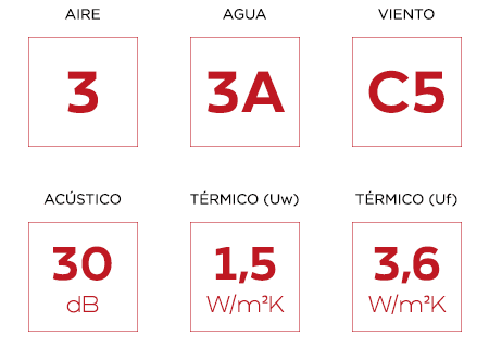 - Transmitancia térmica hasta Uh=1,5W/m2K, según dimensiones y modelo de vidrio instalado.
